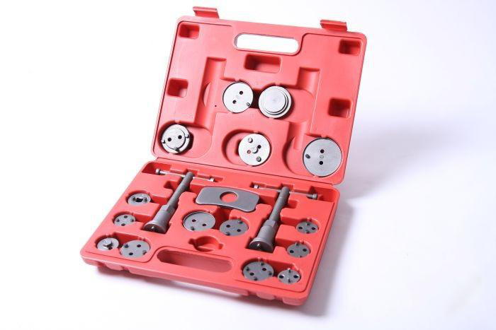 Pomocí této sady snadno zatlačíme jak přední brzdové pístky, tak především zadní, které mají i šroubovici pro ruční brzdu, kdy je třeba na pístek zároveň tlačit i otáčet.