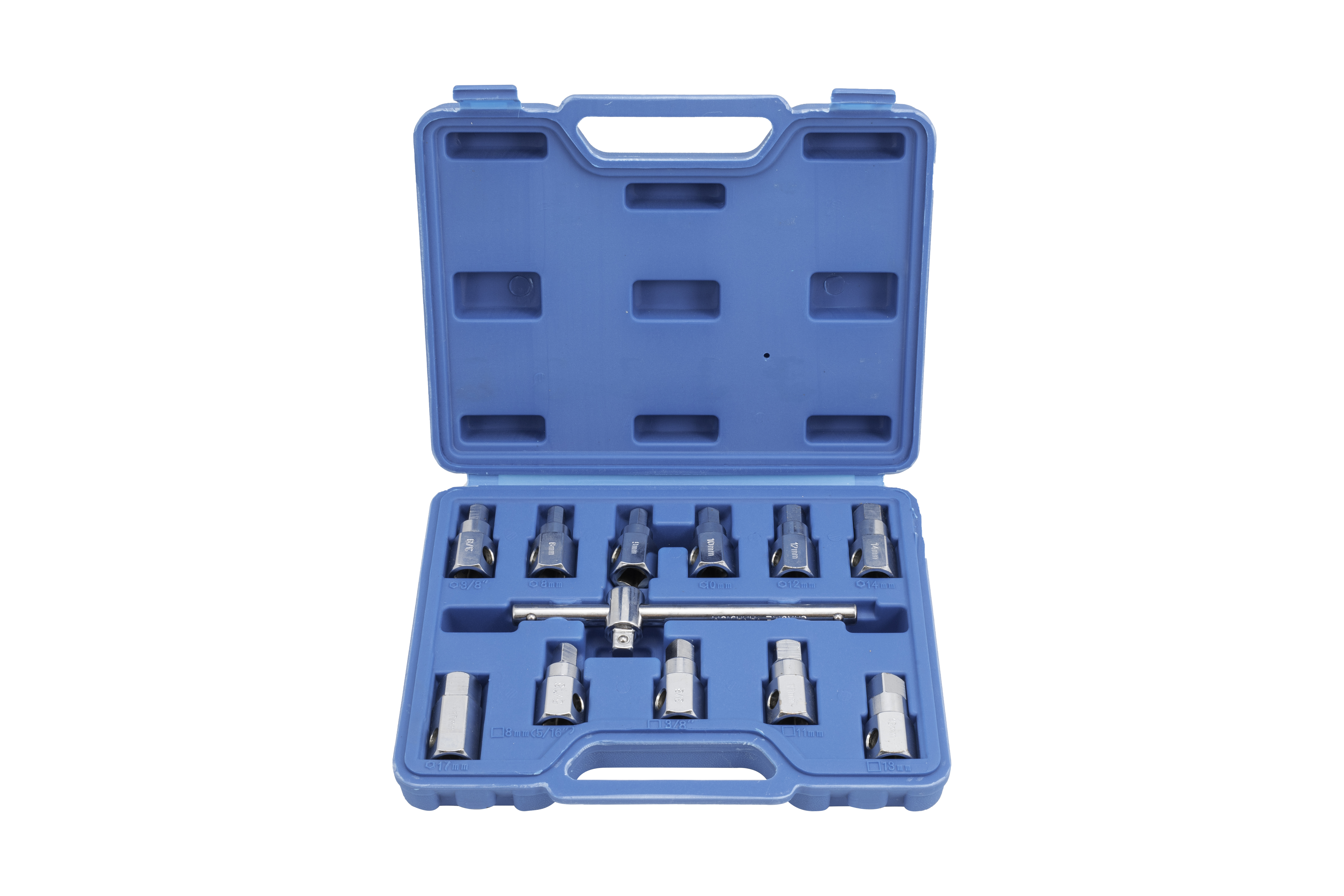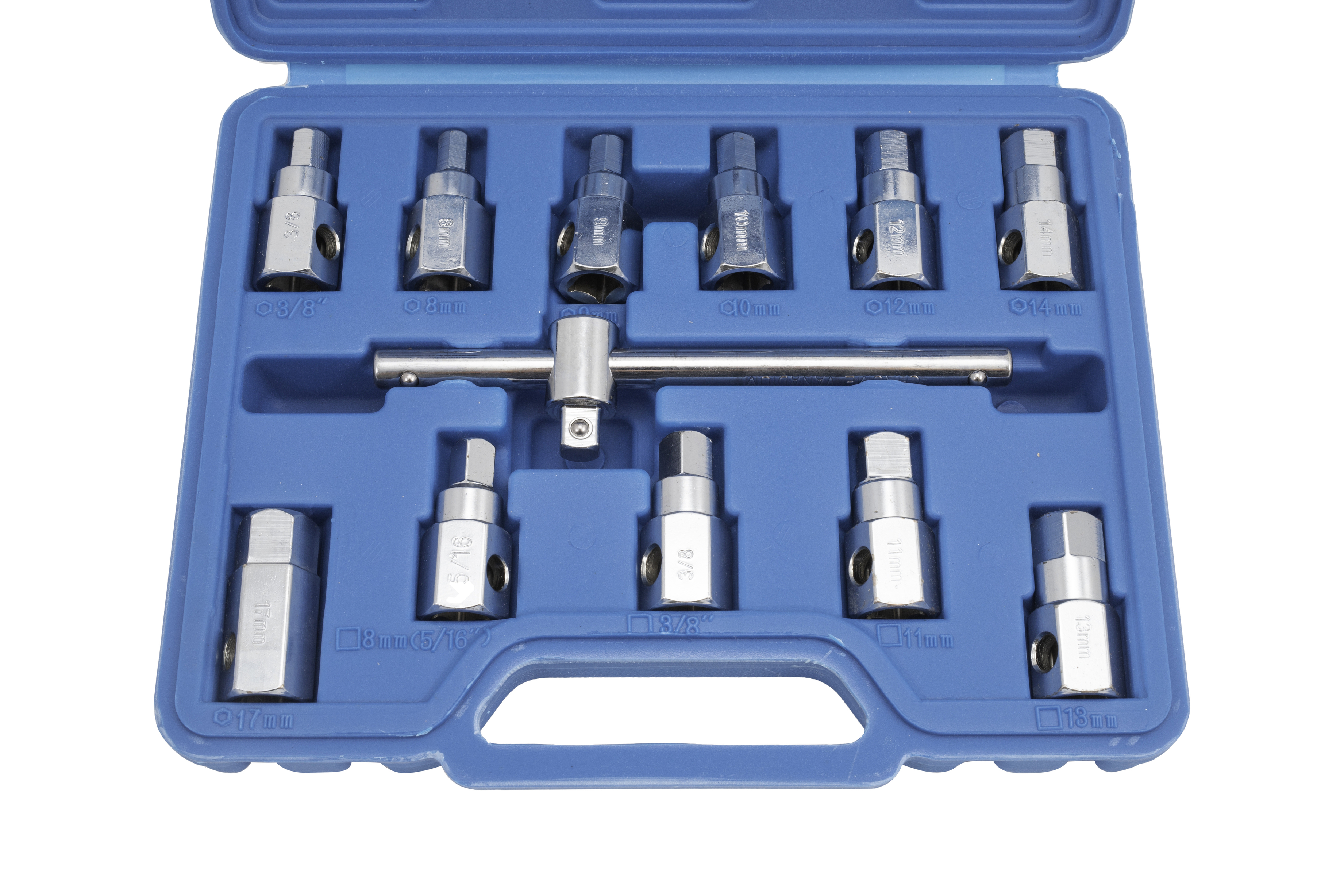 Praktická souprava klíčů a hlavic na povolování šroubů olejových van, převodovek, diferenciálů apod. Součástí setu je 11 hlavic (ořechů) a T-klíč s 3/8” čtyřhranem.