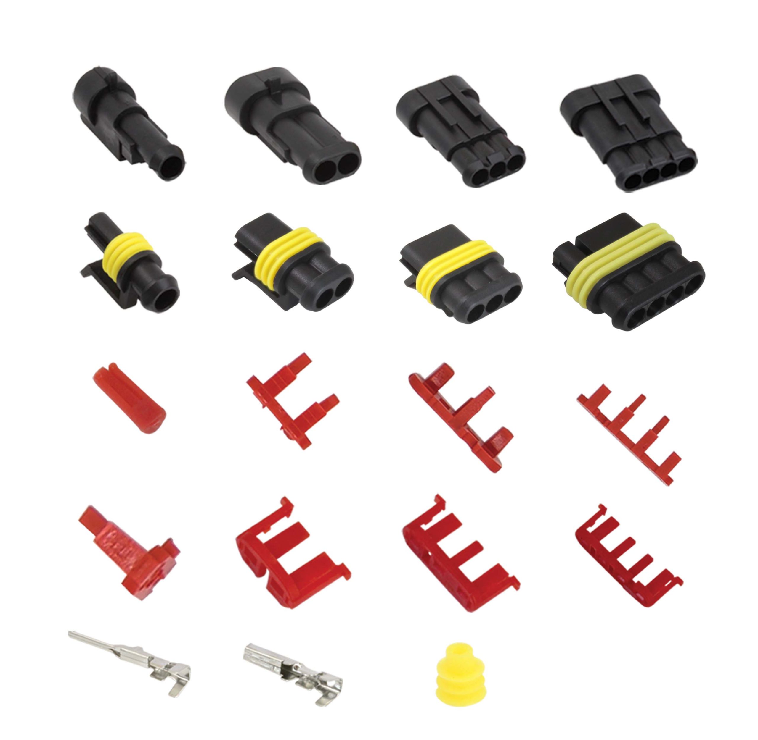 Prakticky poskládaná souprava konektorů s různým počtem kontaktů pro propojení drátů a tenčích kabelů v elektrických soustavách aut, autobusů, traktorů a dalších vozidel.